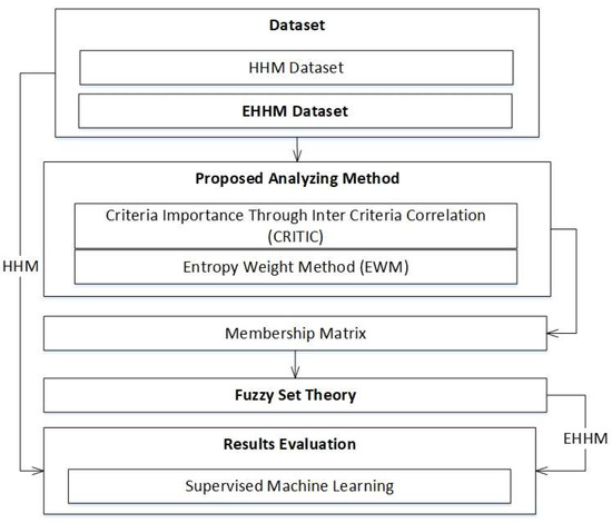 The framework represented in Figure 1 illustrates the structured representation of two datasets, the HHM dataset and the EHMM dataset, which is the initial information to analyze. The proposed analysis approach is based on the integration of CRITIC and EWM, which generate balanced weights with included variability of the data cases represented by the criteria, as well as the relationship among the criteria. The weighted values are transformed to a membership matrix and then utilized with fuzzy set theory to organize risk evaluations with uncertainties and ambiguities. Subsequently, supervised machine learning algorithms are employed to evaluate and validate the results as reliable and predictive practical applications of risk assessment in the cloud.