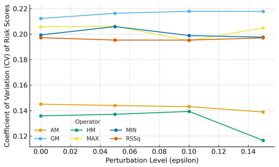 The first component involved introducing ±10% random noise into the normalized criterion values from within each cloud-domain dataset. Entropy and CRITIC weighting were recalculated and then aggregated using each of the six hybrid operators. All hybrid models generated the CV of the final risk score below 0.06, providing evidence that the integrated approach is resilient to small input data changes. The GM and HM hybrid operators had the lowest CV values, indicating greater internal stability, while the MAX and RSSq hybrid operators were more sensitive but with greater discriminatory power across alternatives.