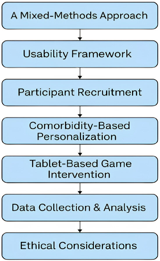 Our combined rigorous quantitative assessment with rich qualitative data provides a comprehensive picture of the game’s impact as a whole research design process, as visualized in Figure 2. In particular, this approach, linking cognitive outcome measures with a structured usability evaluation and ethnographic observation, represents a novel contribution beyond previous work, which has documented cognitive gains from serious games but has seldom incorporated formal usability analysis. A distinguishing innovation of this study was the integration of comorbidity-informed personalization, based on clinically stratified clusters. These clusters informed adaptive game play, session length, interface design, and support strategies. This is the first study to implement such a comorbidity-responsive adaptive engine within an ISO usability framework, enabling dynamic adjustment of game complexity and feedback based on cluster-specific profiles.