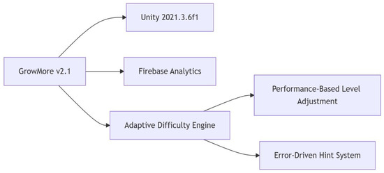 These frameworks guided the structuring of game levels to foster intrinsic motivation by balancing challenge with player skill, supporting autonomy, competence, and relatedness. Scaffolding techniques were implemented to gradually increase task complexity, thereby sustaining engagement and optimizing cognitive load. These principles were operationalized to maintain user focus and encourage repeated participation, which is critical for intervention efficacy with tools like Firebase, Unity, Adaptive Difficulty Engine, Performance-based Level Adjustment, and Error-Driven Hint System, as shown in Figure 3.