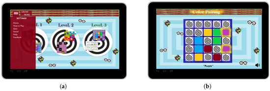 Tablet-Based Application Design: (a) Homepage. (b) Colour Pairing and Puzzle Game.
