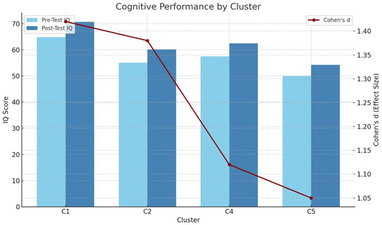 To further ensure statistical rigor, post-intervention analyses included analysis of covariance (ANCOVA), controlling for baseline cognitive scores to account for potential regression effects. Additionally, a linear mixed-effects model was fitted to task performance data with random intercepts per participant to examine learning trends across sessions and clusters. Cluster stability was assessed using silhouette scores and Davies-Bouldin indices across K = 4–6 to verify that the chosen five-cluster configuration represented an optimal trade-off between cohesion and separation. All p-values were adjusted for multiple testing using Bonferroni correction, and effect sizes (Cohen’s d) were reported with 95% confidence intervals.