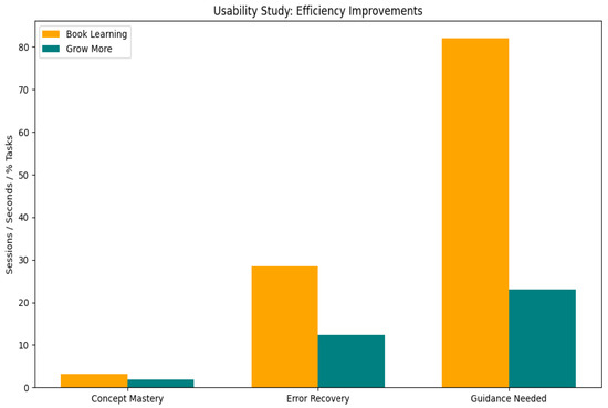 During pilot studies with children with intellectual disabilities (ID), the GrowMore tablet application demonstrated multi-modal teaching capabilities, enabling independent interaction after initial demonstrations. Usability was assessed per ISO 9241-11 [37], covering effectiveness, efficiency, and satisfaction. Effectiveness—measured as task completion and correct quiz responses—averaged 85.3% (±5.6%). Cognitive performance improved by a mean gain of +5.6 points (±1.2), indicating enhanced learning and skill acquisition. Efficiency, measured by average task completion time, was 18.7 s (±2.3), outperforming traditional book-based methods. The interactive environment, including music, animation, and reduced guidance, contributed to superior engagement.