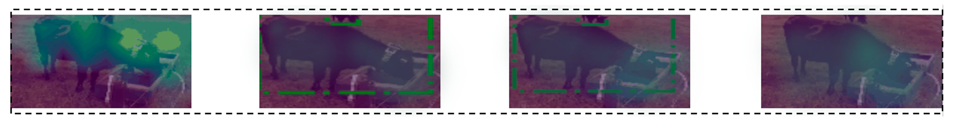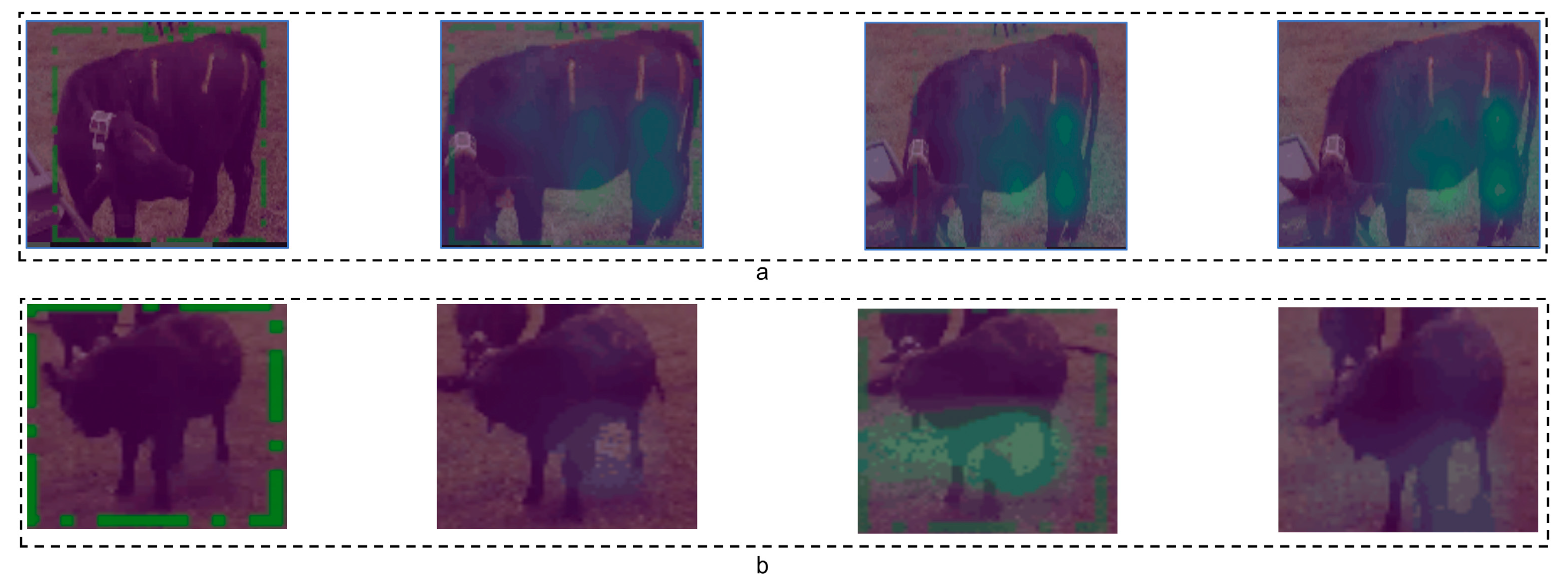 Figure 8), the model accurately focuses on the abdominal region when the cattle face the camera; however, when the cattle are oriented away from the camera, the attention shifts to the limbs. This observation indicates that occlusion and viewpoint variations continue to affect the model’s ability to temporally model key body regions. To address this limitation, future work could leverage multi-view learning and region-level attention mechanisms to enhance the model’s spatio-temporal representation capabilities in small-scale regions.