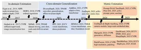 Figure 1 illustrates the development trajectory of monocular depth estimation (MDE) from 2014 to 2025, showing the gradual evolution from narrow-domain regression models to cross-domain generalization and ultimately to MMDE. Early methods, from Eigen et al. (2014) [52] to MiDaS (2020) [82], primarily focused on single-domain or dataset-specific regression. These approaches relied on scale-invariant losses, ordinal regression, and self- or unsupervised image reconstruction objectives, which effectively captured relative depth but lacked metric consistency and generalization capability. Their scope remained constrained to controlled environments, limiting applicability across diverse domains.