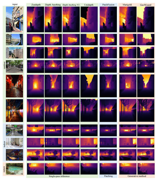 Generative Methods: Generative diffusion techniques have introduced effective solutions for reducing edge smoothing and enhancing structural fidelity in depth estimation. By simulating image degradation and iteratively restoring missing information, these models can reconstruct high-frequency structures more accurately than traditional discriminative approaches [35,77,78,79]. Early work such as Marigold applied diffusion to depth estimation, producing sharper edges and improved structural consistency compared with baseline models [35]. However, its performance declines in scenes with multiple objects or complex spatial layouts, revealing limitations in dense environments.