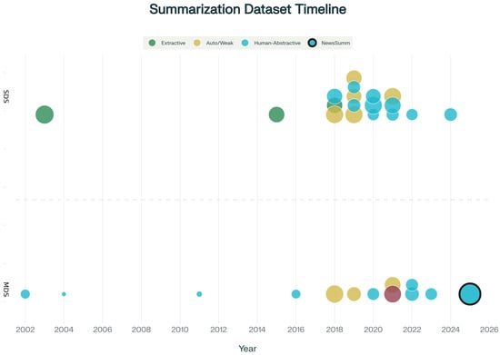 Timeline matrix of major single-document (SDS) and multi-document (MDS) summarization datasets (2002–2026).