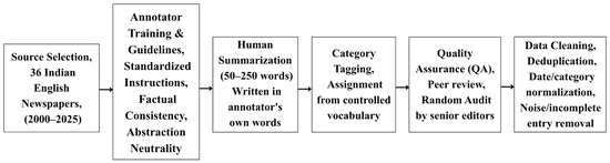 A distributed team of over 14,000 trained volunteers collected and annotated the data using a standardized protocol. Annotators extracted metadata including headline, publication date, source, and URL, and composed 50–250-word abstractive summaries in their own words. Each article was tagged with one or more topical categories from a predefined taxonomy. The process involved manual article entry through structured forms, daily and archival collection, and summarization with emphasis on neutrality, coherence, and informativeness. Annotator metadata and timestamps were recorded to ensure reproducibility. Figure 2 illustrates the pipeline from source selection through annotation and quality control. Having described how entries are created, we next formalize the rules that guide annotators and the checks that enforce them in Section 3.2.