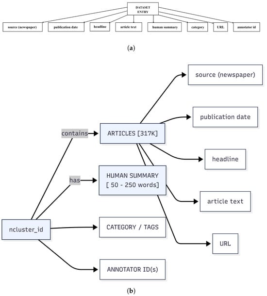Post-annotation, the dataset underwent cleaning to ensure consistency and integrity. Duplicate entries were identified and removed through a combination of automated similarity checks and manual review. Dates and category labels were standardized for uniformity across the corpus. Incomplete or noisy records—such as those with missing headlines or summaries below the minimum length—were flagged and either corrected or excluded. Finally, all records were validated against a predefined schema to ensure field completeness and correct formatting (see Figure 3a,b). Each record contains eight core fields: source (newspaper), publication date, headline, article text, human summary, category/tags, URL (for source traceability), and annotator ID (for quality auditing and reproducibility). After normalization and schema validation, we situate NewsSumm relative to established practices to facilitate comparability and reuse.