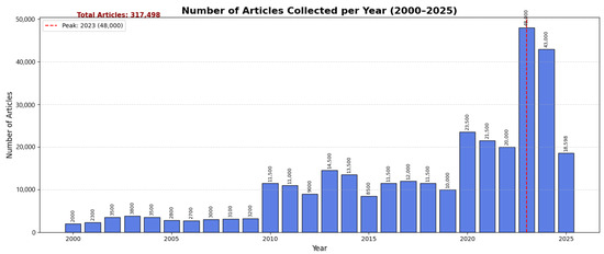 NewsSumm spans articles published from 2000 to 2025, enabling longitudinal analyses of media trends across a 25-year period. As shown in Figure 6, the dataset exhibits steady growth over time, with marked surges during major national events, reflecting both evolving news volume and collection dynamics. Having established temporal coverage, we next examine topical breadth and category balance in Section 4.2.