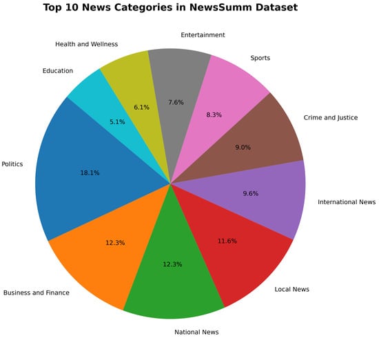 Top 10 most frequent news categories in the NewsSumm dataset. The figure illustrates category distribution across major domains, highlighting prevalent topics such as politics, business, and sports.