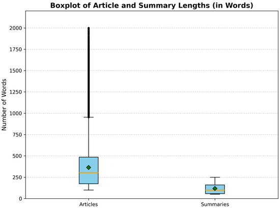 To support downstream model design, we examined token-level distributions using HuggingFace’s AutoTokenizer. Figure 8 shows boxplots of token counts in both articles and summaries, capturing central tendencies and variance, along with the presence of long-tailed outliers. Building on these sequence length statistics, Section 4.4 quantifies summarization difficulty via article-to-summary compression ratios.