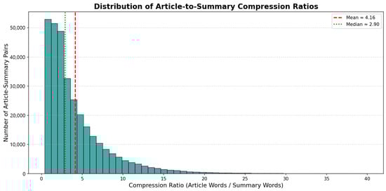 Histogram of article-to-summary compression ratios. The figure illustrates the distribution of compression ratios across the dataset, highlighting the balance between article length and summary length, and indicating summarization difficulty levels.