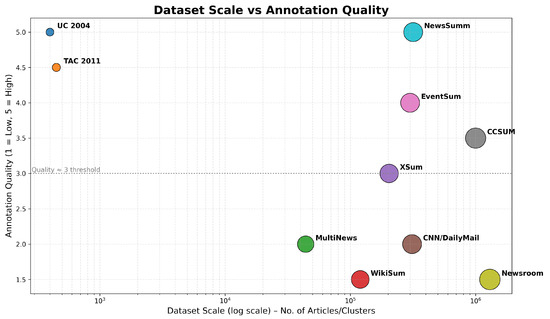 Scatter plot of summarization datasets by size and annotation quality. NewsSumm is uniquely positioned in the top-right quadrant, combining large-scale and high-quality human-written multi-document summaries, demonstrating its strength as a benchmark for future research.