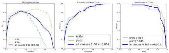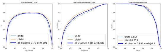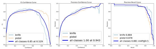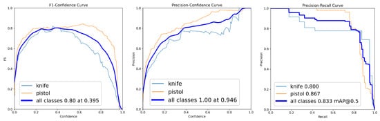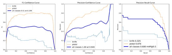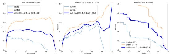 The first round served as the baseline for assessing initial detection capabilities. The model achieved an overall F1-score of 0.45 (at confidence 0.438) and mAP@0.5 of 0.518 (Table 4). Class-level analysis revealed a performance disparity, with the “pistol” class achieving F1-score = 0.63 and mAP@0.5 = 0.772, while the “knife” class showed F1-score = 0.28 and mAP@0.5 = 0.263. The F1-score–confidence, precision–confidence and precision–recall curves (Figure 2) further illustrated this class level difference, with the knife class showing notably lower performance across all metrics.