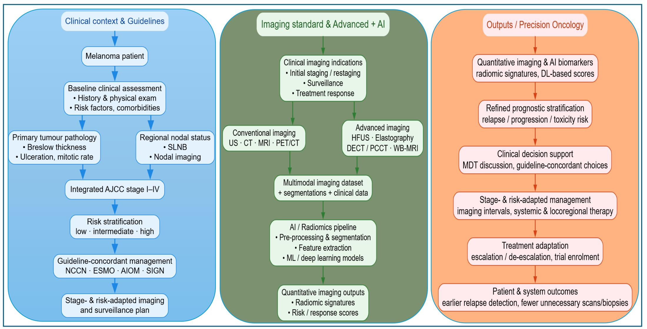 | Melanoma specific strengths (examples) | PET/CT: systemic staging/therapy response; CT: lung/viscera; MRI: brain/soft tissue; US: nodal assessment | HFUS: sub-mm superficial and in transit disease; Elastography: nodal stiffness; DECT: iodine maps conspicuity; PCCT: high spatial/spectral, fewer artifacts; WB-MRI: whole-body marrow and bone metastasis |