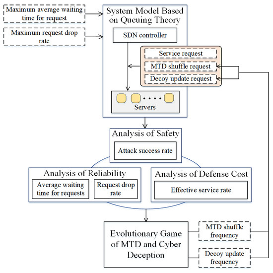 We consider the defender’s MTD and cyber deception strategies as competitive strategies and construct an evolutionary game model. The system state comes from a queuing model. We build a payoff function that balances security gain, reliability, and cost, set up the optimization problem, and then use replicator dynamics to update strategy probabilities until they converge to optimal trigger and update rates.