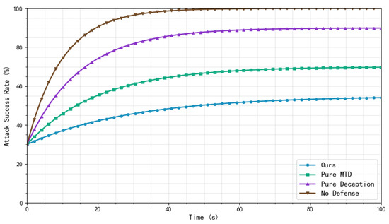 We set the basic attack success rate at and evaluate how the attacker’s success rate changes over time, as shown in Figure 2. The curve representing the non-defense strategy illustrates the change in attack success rate over time. Due to the attacker’s ability to detect decoys, the success rate of attacks under a pure deception strategy is approximately 90%. Although the pure MTD strategy can effectively mitigate attacks, its restrictions on reliability prevent it from achieving optimal effects. Our method stabilizes at approximately 55%, effectively limiting further growth. This proves that hybrid defense methods can effectively ensure the system’s security compared to pure MTD and deception methods.