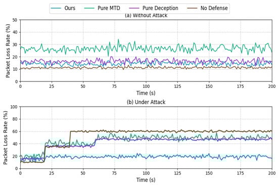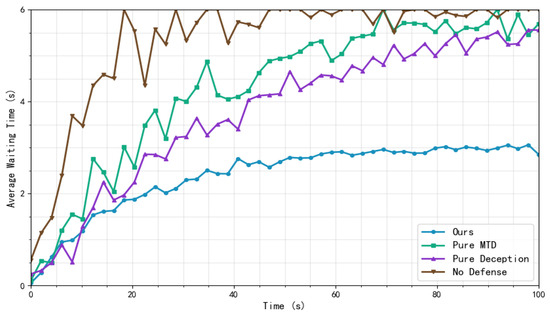 Figure 3 presents the change in request waiting time during the attack. Many servers are compromised, and the system cannot process requests effectively without defences. Our method enforces a bound on waiting time and converges to about 3 s. For the other strategies, the average waiting time rises and approaches the maximum limit. Figure 4 compares the average packet loss rate with and without attacks. In the absence of attacks, our method has a slightly higher packet loss rate than no defense and is close to the pure cyber deception strategy. Under attack, the packet loss rates of the pure MTD and pure cyber deception strategies increase rapidly and reach up to 50%. Our method effectively constrained the packet loss rate. This proves that hybrid defense methods can effectively ensure the system’s reliability compared to pure MTD and deception methods.