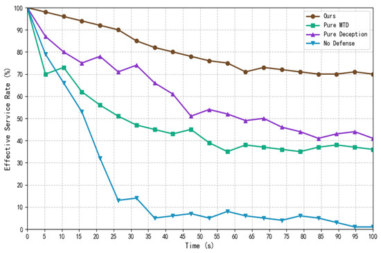 Figure 5 shows the effective service rate during the attack. As the attack continues, a system without defense suffers server failures and its effective service rate drops sharply. The pure MTD strategy also declines quickly due to the frequent MTD requests. The pure cyber deception strategy updates less often, so its effective service rate decreases slowly. Our method shows a similar downward trend to deception and, with resource overhead constrained, it stabilizes at about 70%. This proves hybrid defense methods can effectively reduce defense costs compared to pure MTD and deception methods.