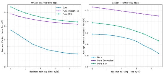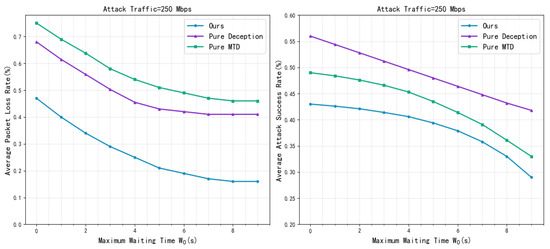 Then, we varied the attack intensity to evaluate how security, resource overhead, and availability relate under different attack levels. We first adjusted the maximum waiting time limit to get the relationship between attack success rate and average packet loss rate. Figure 6 and Figure 7 show that when attack traffic is 250 Mbps, lowering the maximum waiting time limit reduces the average packet loss rate. In this case, both the deception method and our method keep the attack success rate low while maintaining service availability. The MTD strategy can suppress the attack success rate, but it cannot sustain normal availability. When attack traffic rises to 500 Mbps, the attack success rate under the cyber deception method increases significantly. In contrast, our method continues to reduce the attack success rate and keeps the system available.