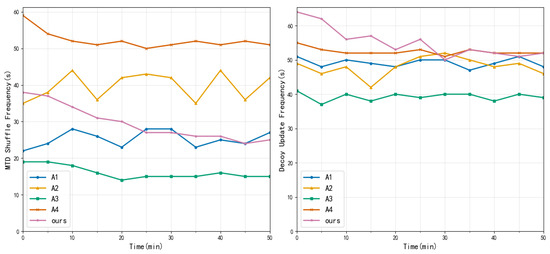 We also measure the change in defense strategies over time. As shown in Figure 8, A1 can balance security and reliability, but raising the MTD shuffle frequency and the decoy update frequency consumes the processing capacity needed for regular services. A2 supports more precise defense deployment, yet lowering the defense frequency leaves security insufficiently protected. A3 seeks to reduce the attack success rate by issuing many MTD shuffle and decoy update requests, but it cannot maintain system reliability or control defense overhead. A4 seeks to ensure the system’s reliability by reducing the defense deployment, but sacrificing security does not improve reliability. Our method has a slightly higher attack success rate than A3 but effectively preserves reliability and keeps defense overhead in check.