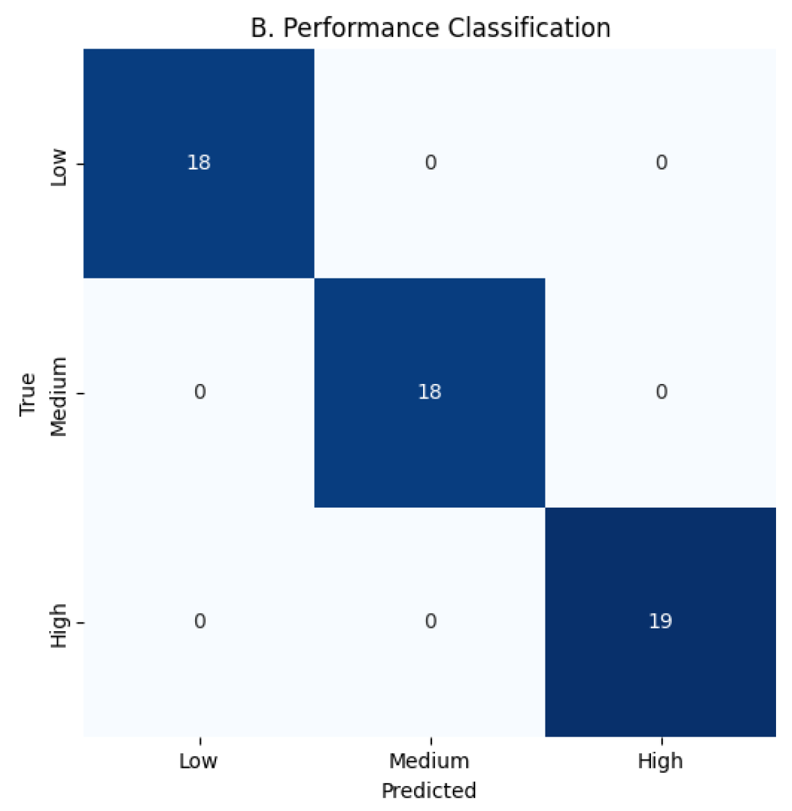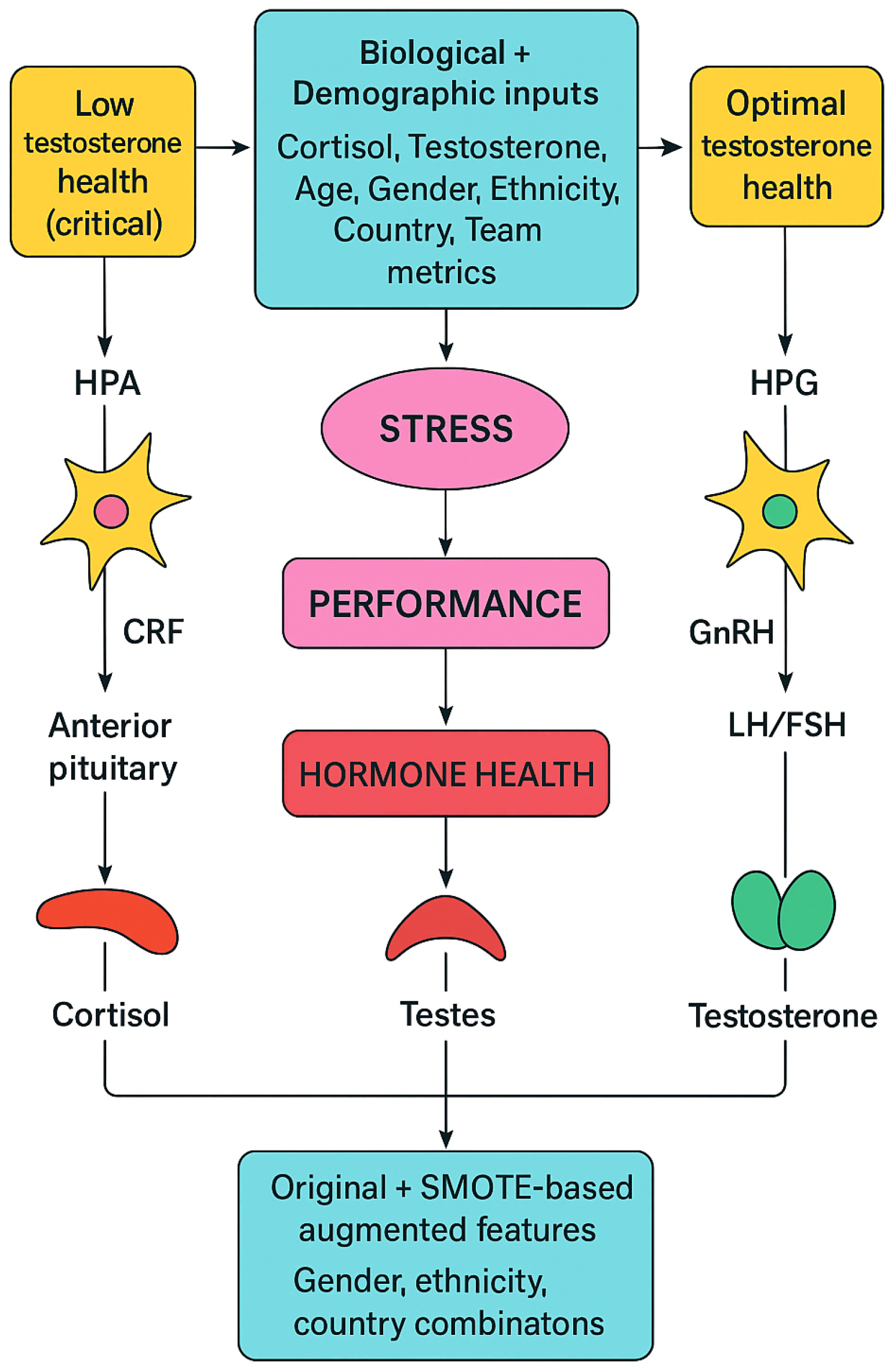 41]. Controlling for the three class outputs—Stress (cortisol), Performance (team results), and Hormone Health (testosterone) enabled both forward inference (biological + context to outcomes) and reverse inference (predicted outcomes to hormone health), thereby improving interpretability.