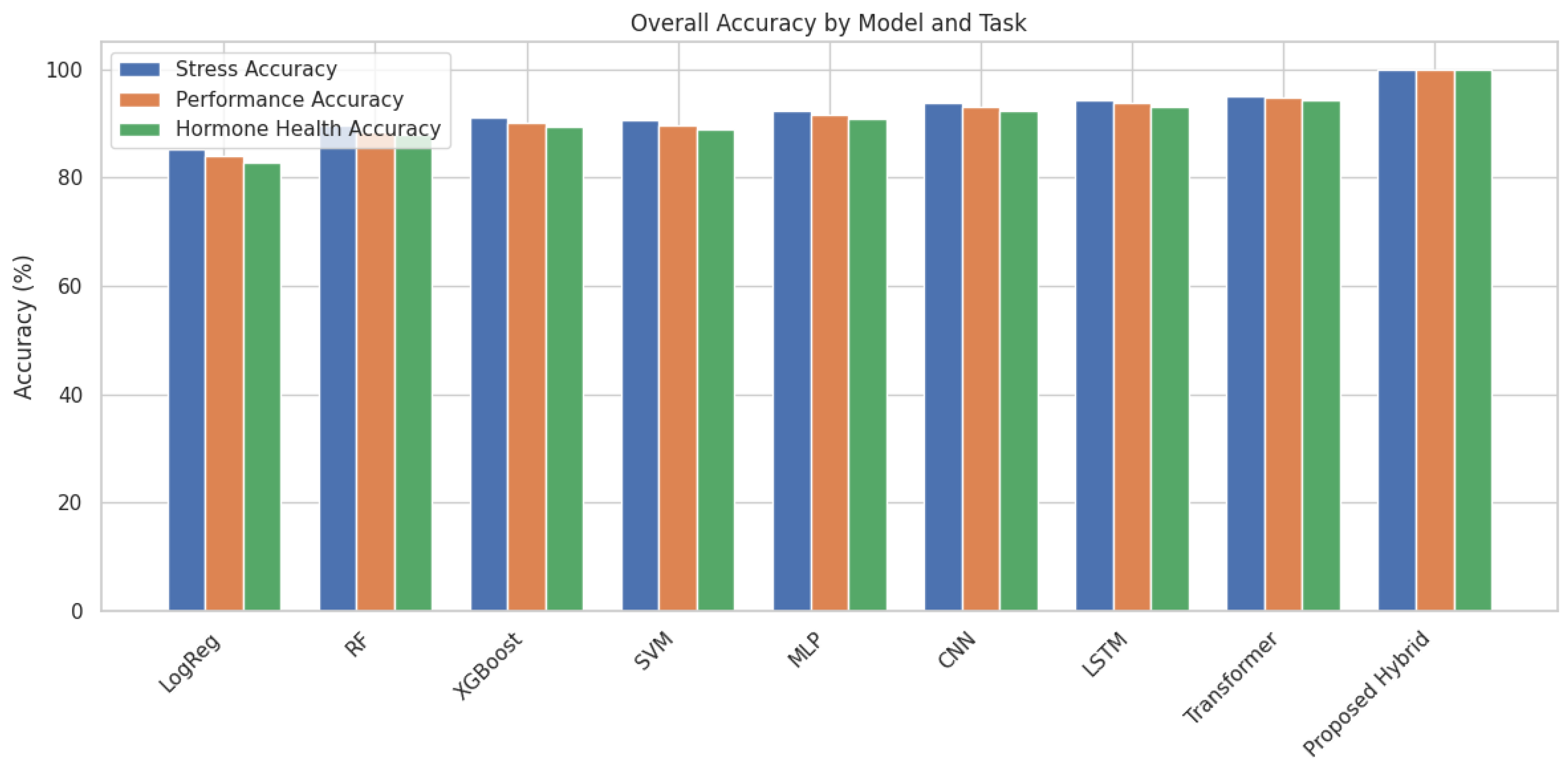 | Model | Stress Accuracy (%) | Performance Accuracy (%) | HH Accuracy (%) | MacroF1 (Stress) | MCC (Performance) | ECE (Hormone Health) |
