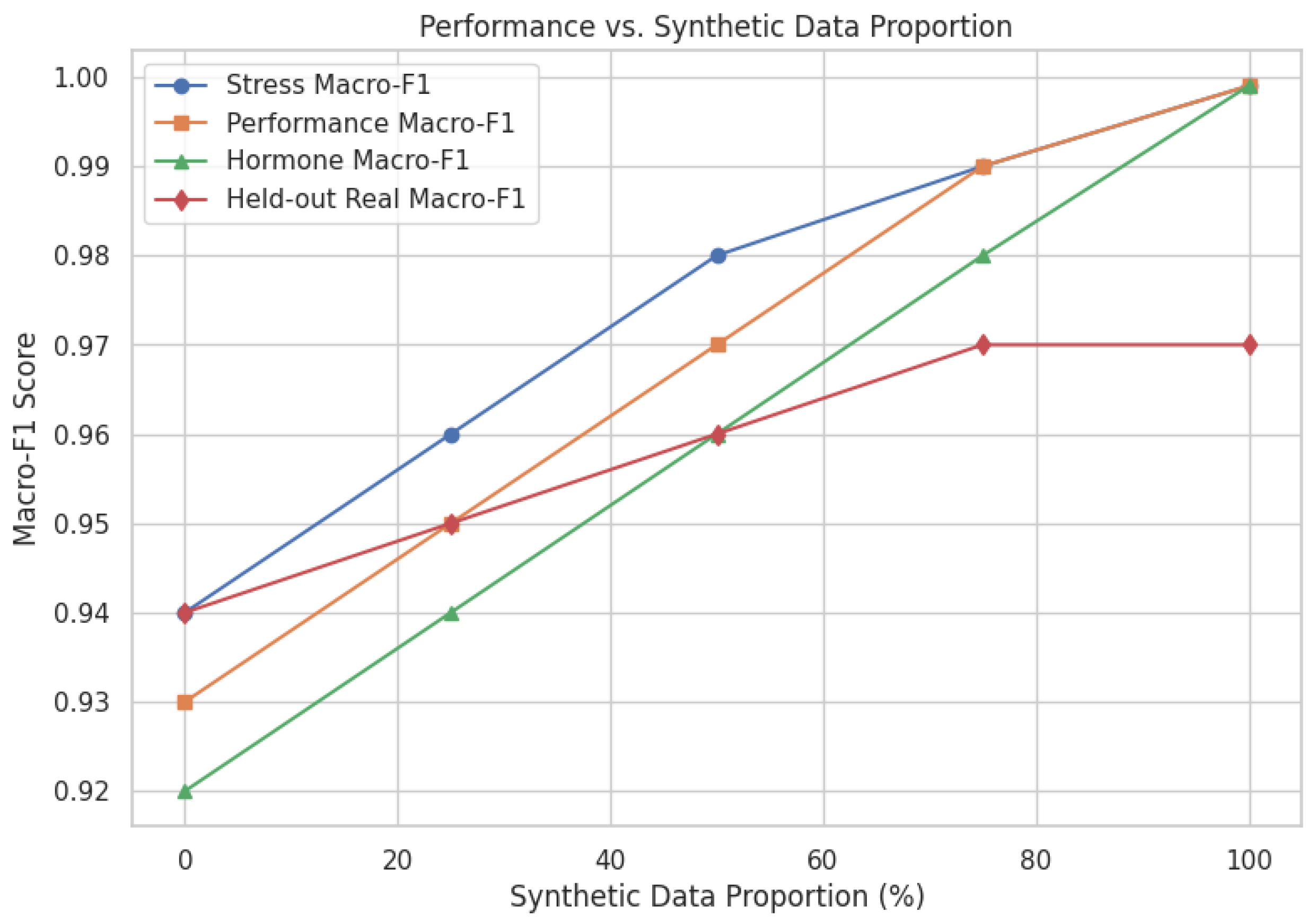 | Synthetic Proportion | Stress MacroF1 | Performance MacroF1 | Hormone MacroF1 | Held-Out Real MacroF1 |
