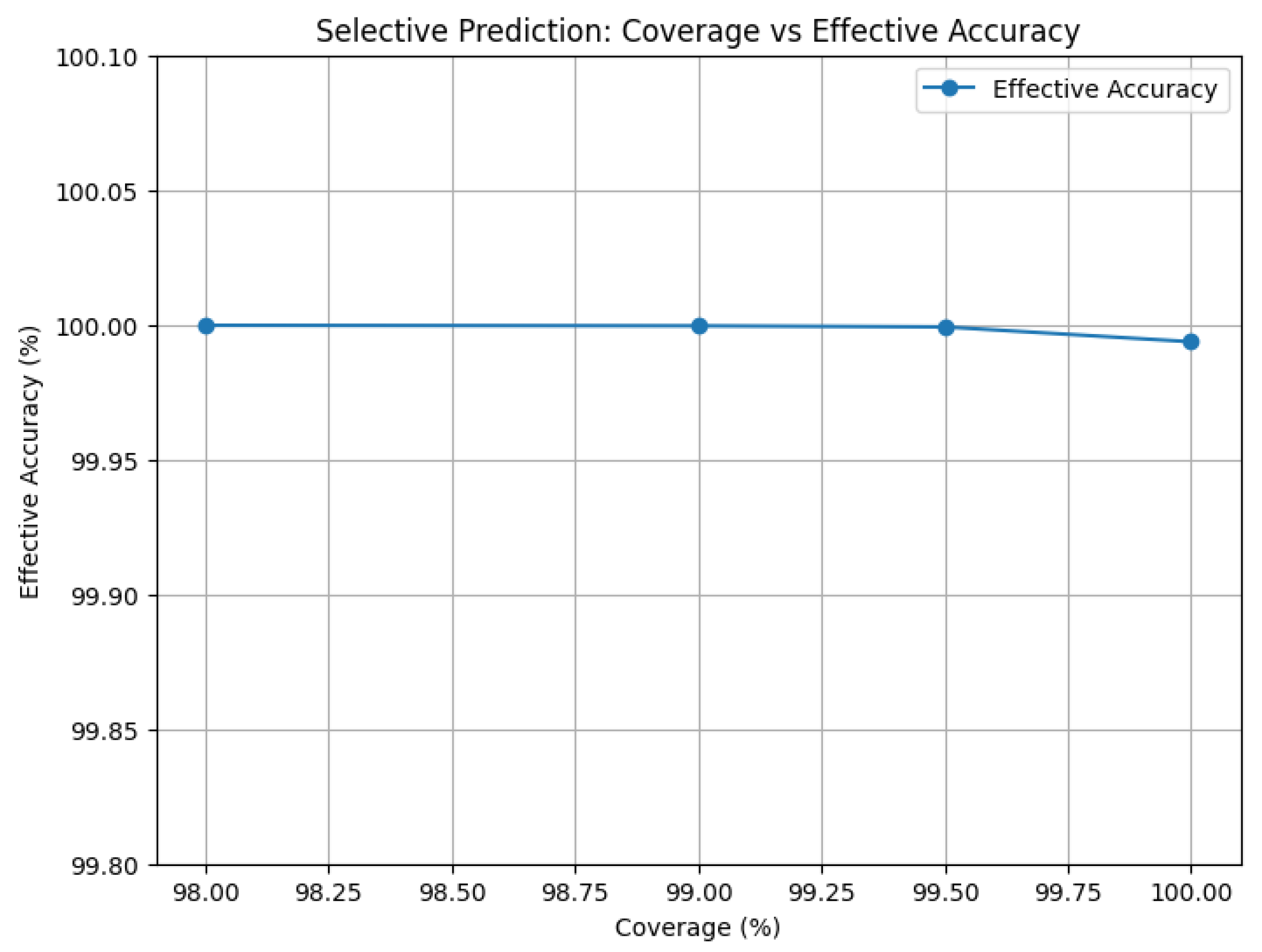 | Abstention Rate (%) | Coverage (%) | Effective Accuracy (%) |