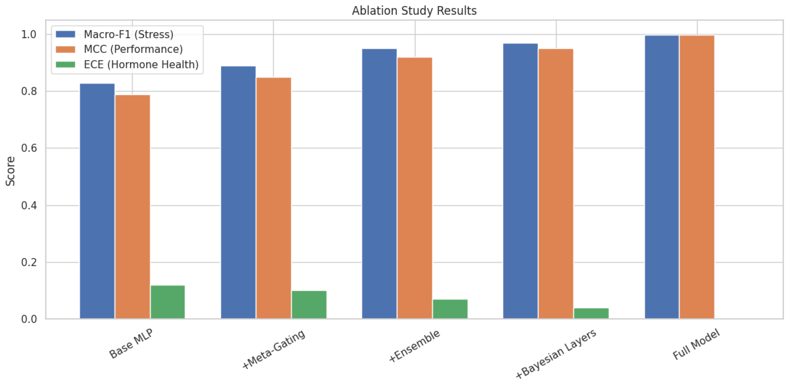 | Model Variant | MacroF1 (Stress) | MCC (Performance) | ECE (Hormone Health) | Std. Dev. (Accuracy) |