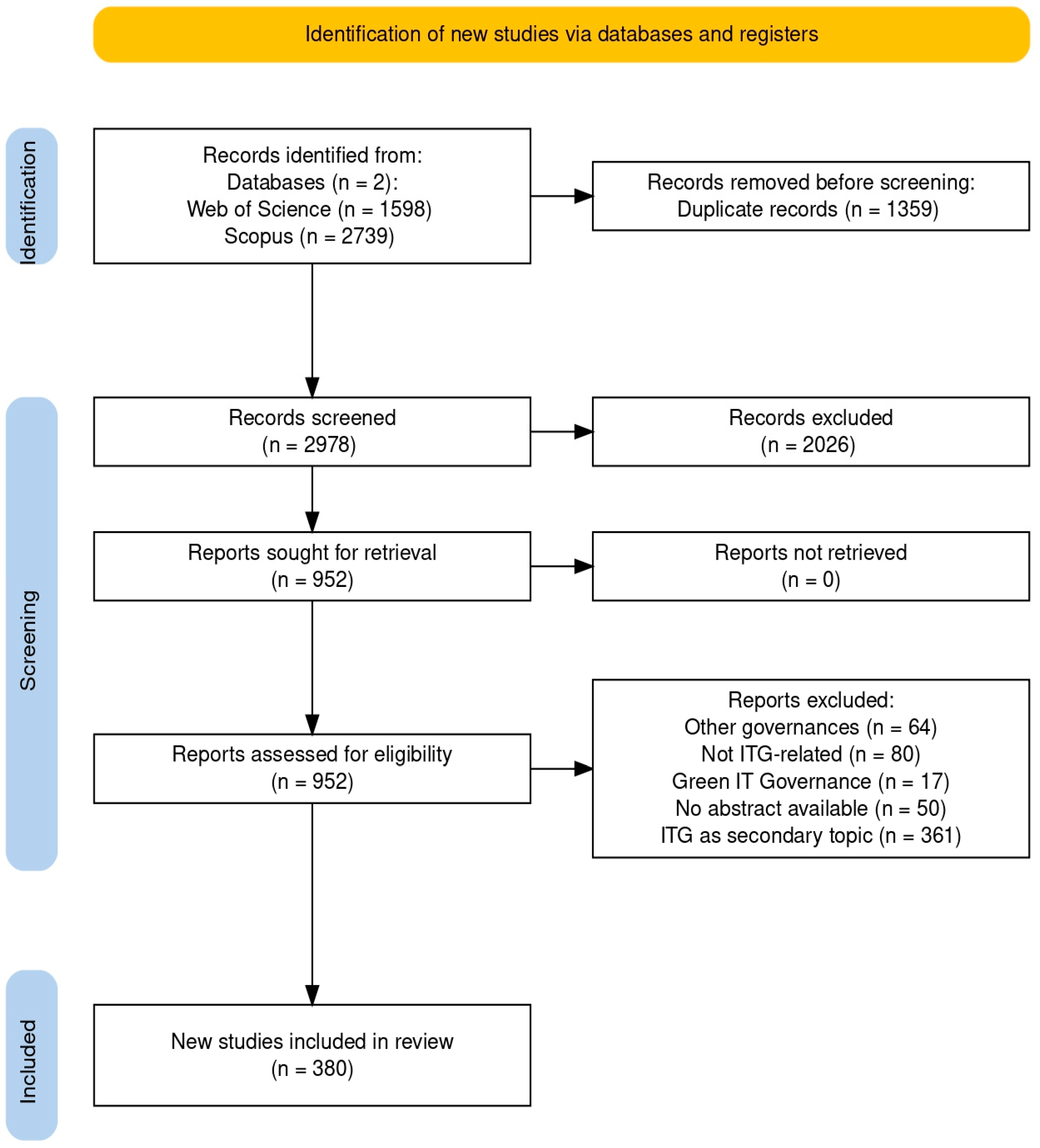- Articles in which IT governance played a secondary or mediating role: 361 records excluded (e.g., term comparisons, teaching IT governance, or examining the impact of IT on political governance).