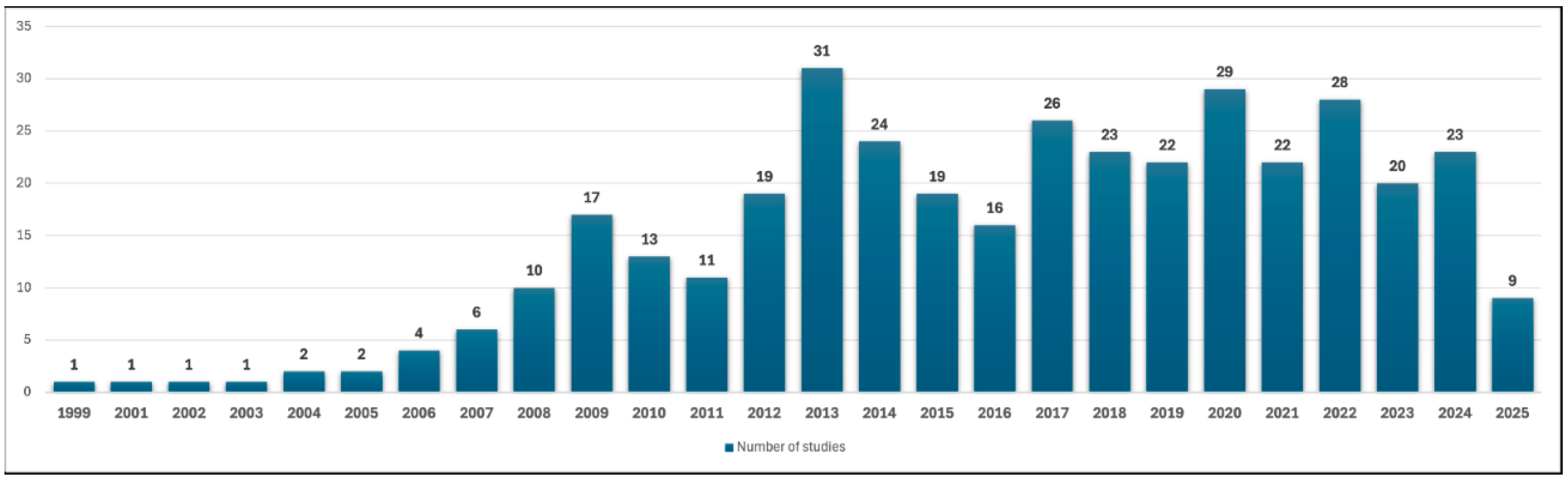 - RQ1: How has scientific output on IT governance evolved between 1999 and 2025? This question focuses on the temporal evolution of publications indexed in Scopus and Web of Science (WoS).