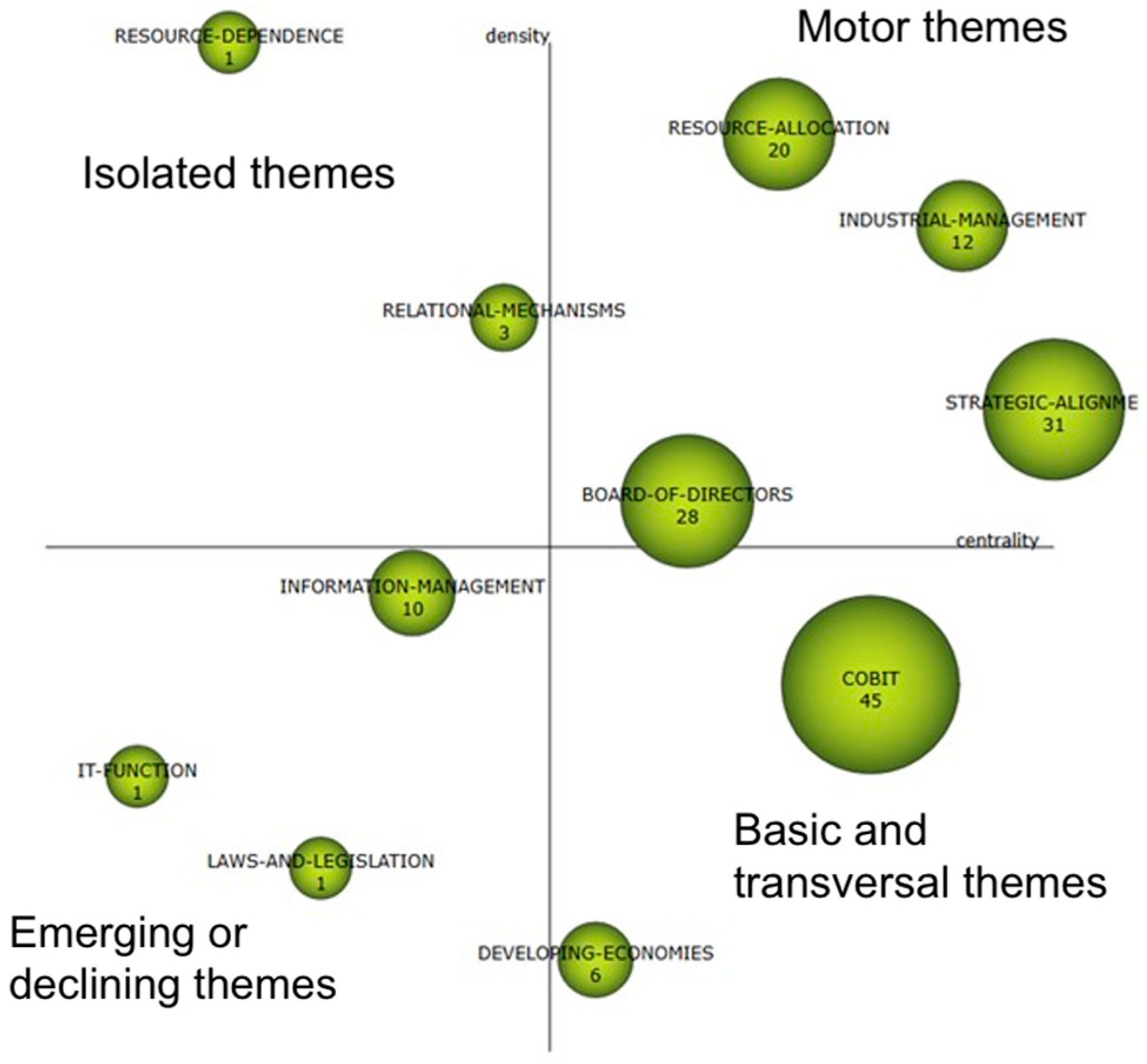 - Lower-left quadrant: Weakly developed and marginal themes that are either emerging or in decline.