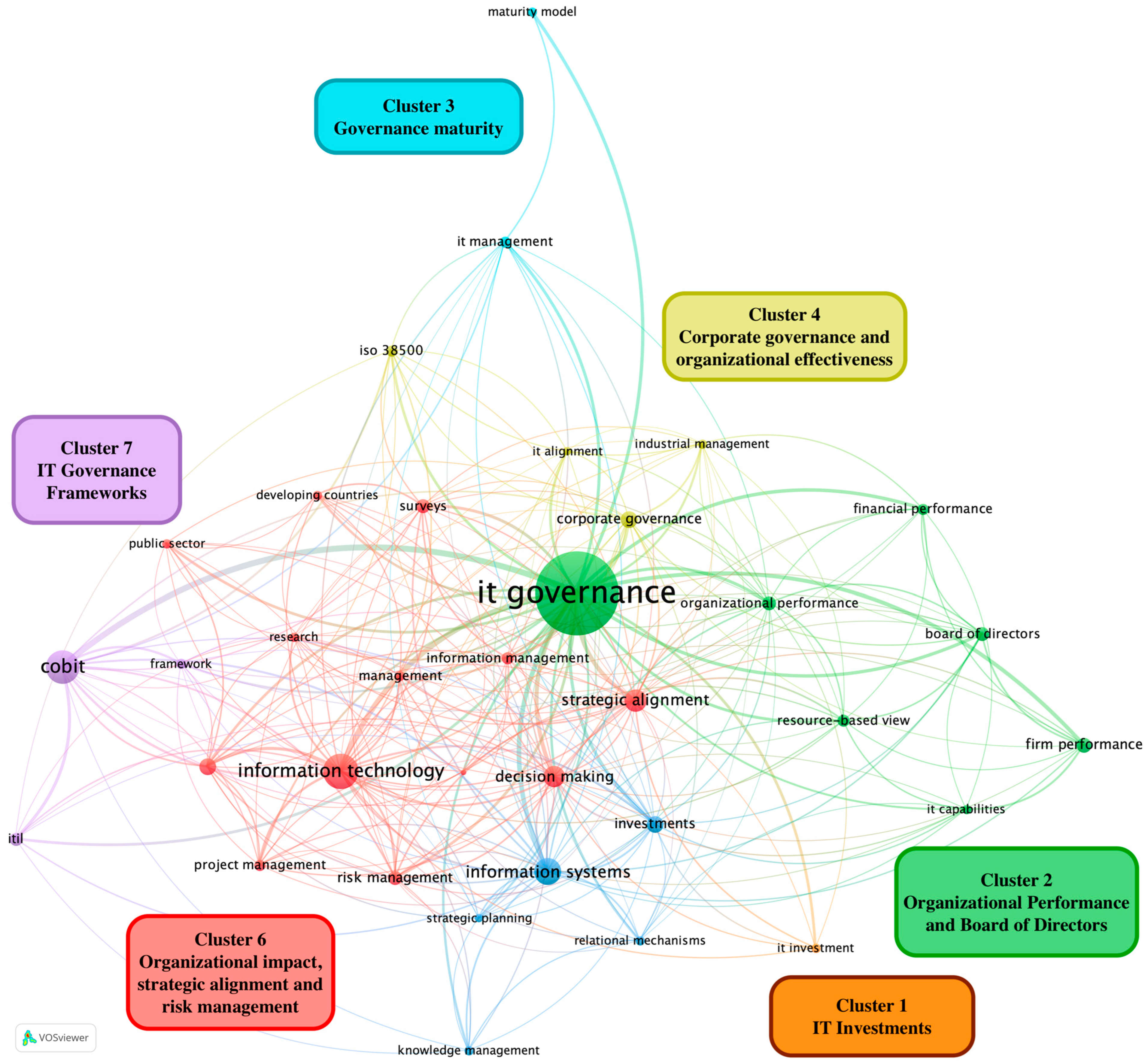 - RQ5: What are the principal thematic groups found in the IT governance literature? This question focuses on clustering key areas and understanding their interconnections.