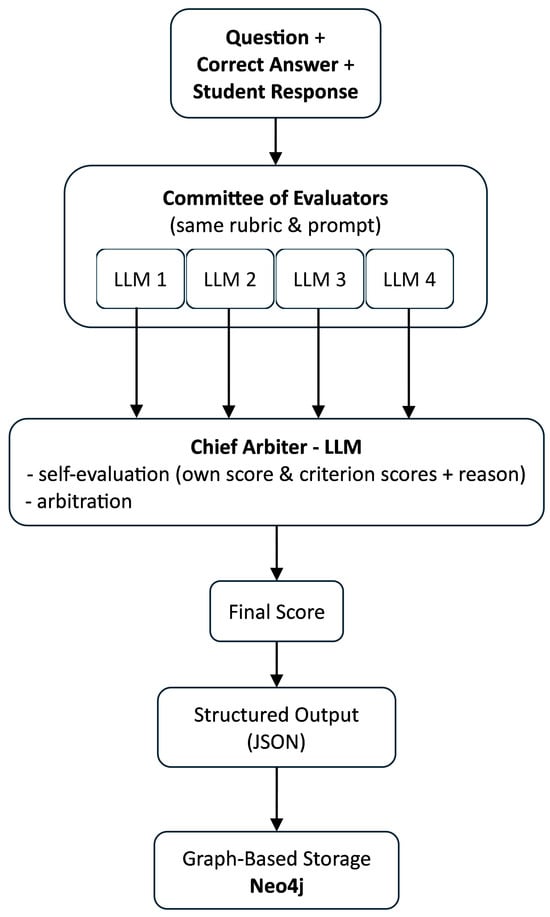 The evaluation pipeline implemented in EvalCouncil was designed to ensure robustness, transparency, and pedagogical relevance in grading student responses. The workflow begins with the collection of a student’s answer, which is paired with the original question and ground-truth solution. This package is then passed to the evaluation committee, where four independent LLMs apply the same rubric and produce criterion-based scores accompanied by reasoning. Their outputs are aggregated and adjudicated by the chief arbiter, who synthesizes consensus or resolves disagreements to deliver a stable final grade, as illustrated in Figure 1. The outcome is expressed in a structured JSON format, ensuring machine-readability and comparability across runs. Finally, all intermediate evaluations, arbitration steps, and final decisions are persistently stored in a Neo4j graph database, which encodes the relationships among runs, items, responses, scores, and decisions. This graph structure captures the full evaluation lineage across prompts, rubrics, graders, and scores, supporting systematic post hoc analysis and facilitating reproducibility across experiments [35].
