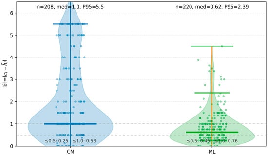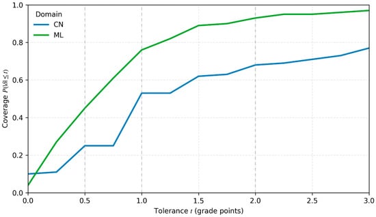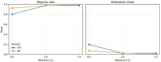 Varying the concordance tolerance over a plausible range preserves the qualitative contrast between domains. As increases, concordance curves rise monotonically, yet the relative ordering remains stable: ML consistently exhibits higher agreement and shorter upper tails than CN. This indicates that the ML–CN gap is not an artifact of a particular threshold and that reasonable grading policies–whether stricter or more permissive–lead to the same directional conclusions. Practically, the tolerance acts as a policy dial: tighter settings reduce false concordance at the cost of more adjudications; looser settings reduce workload while preserving the cross-domain ranking of alignment.