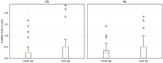 These contrasts are stable under reasonable design choices. Varying the tolerance –the absolute score difference below which two grades are considered concordant–preserves the ML–CN gap in both central tendency and upper-tail behavior. Likewise, leave-one-out perturbations of panel composition do not materially alter the rankings or the qualitative effect signs: central estimates and dispersion profiles remain similar when any single grader is removed. Taken together, the evidence supports more stable alignment in ML and domain-specific instability in CN, with operational implications for rubric calibration, grader guidance, workload allocation, and adjudication thresholds.