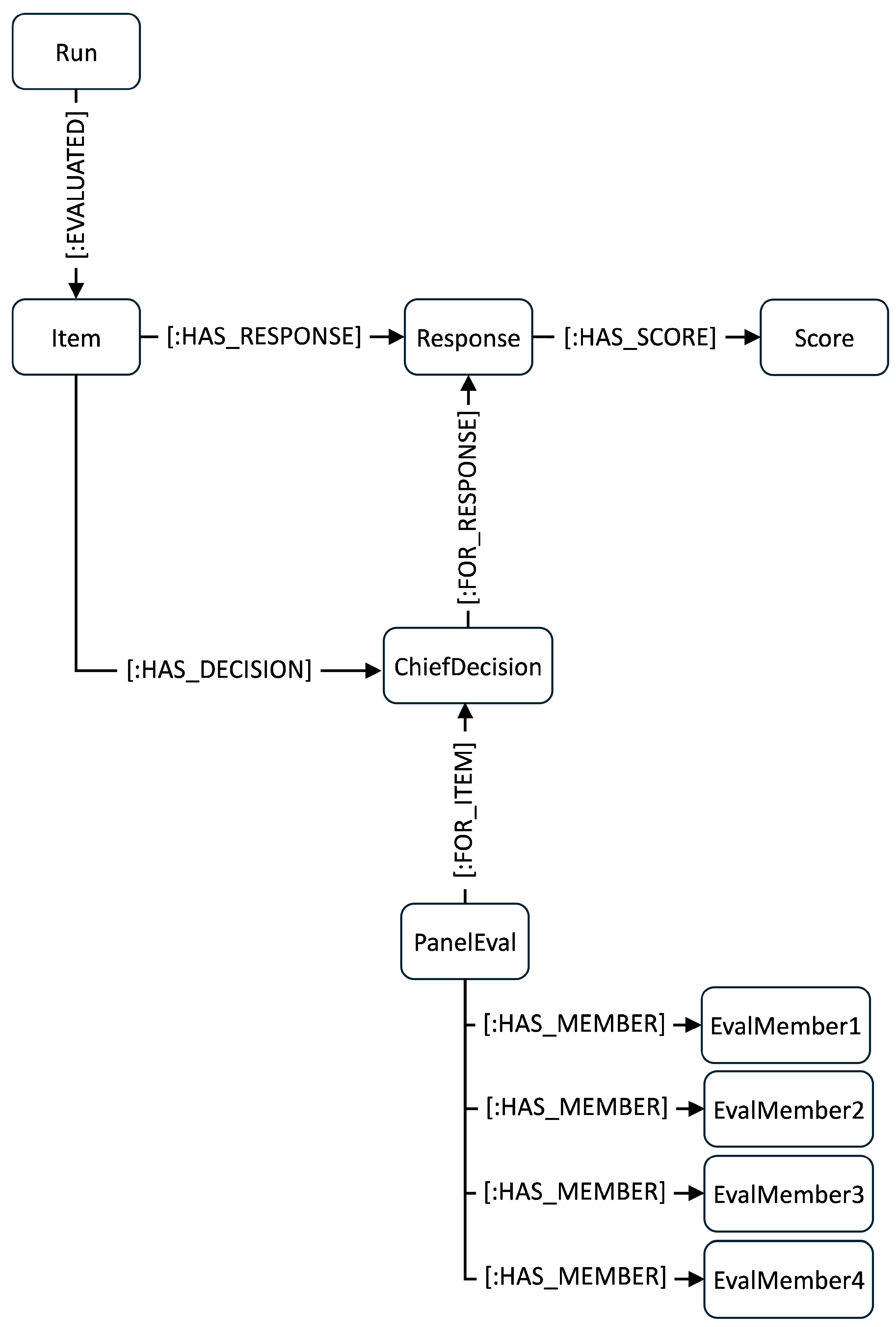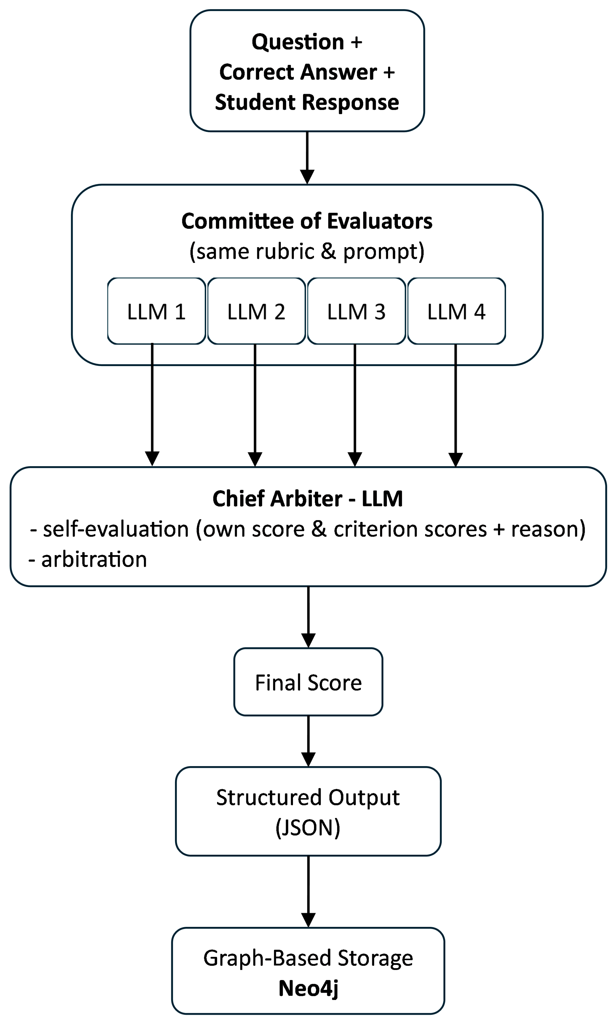 Finally, EvalCouncil emphasizes auditability and transparency. Every evaluation step, from individual committee judgments to the arbiter’s decision, is stored together with reasoning traces. All evaluation artifacts and reasoning traces are stored in the graph database Neo4j [34], enabling lineage queries, reproducibility checks, and exact replay. These records can be inspected, replicated, and validated, allowing educators, researchers, and policymakers to audit the process and build trust in the outcomes.