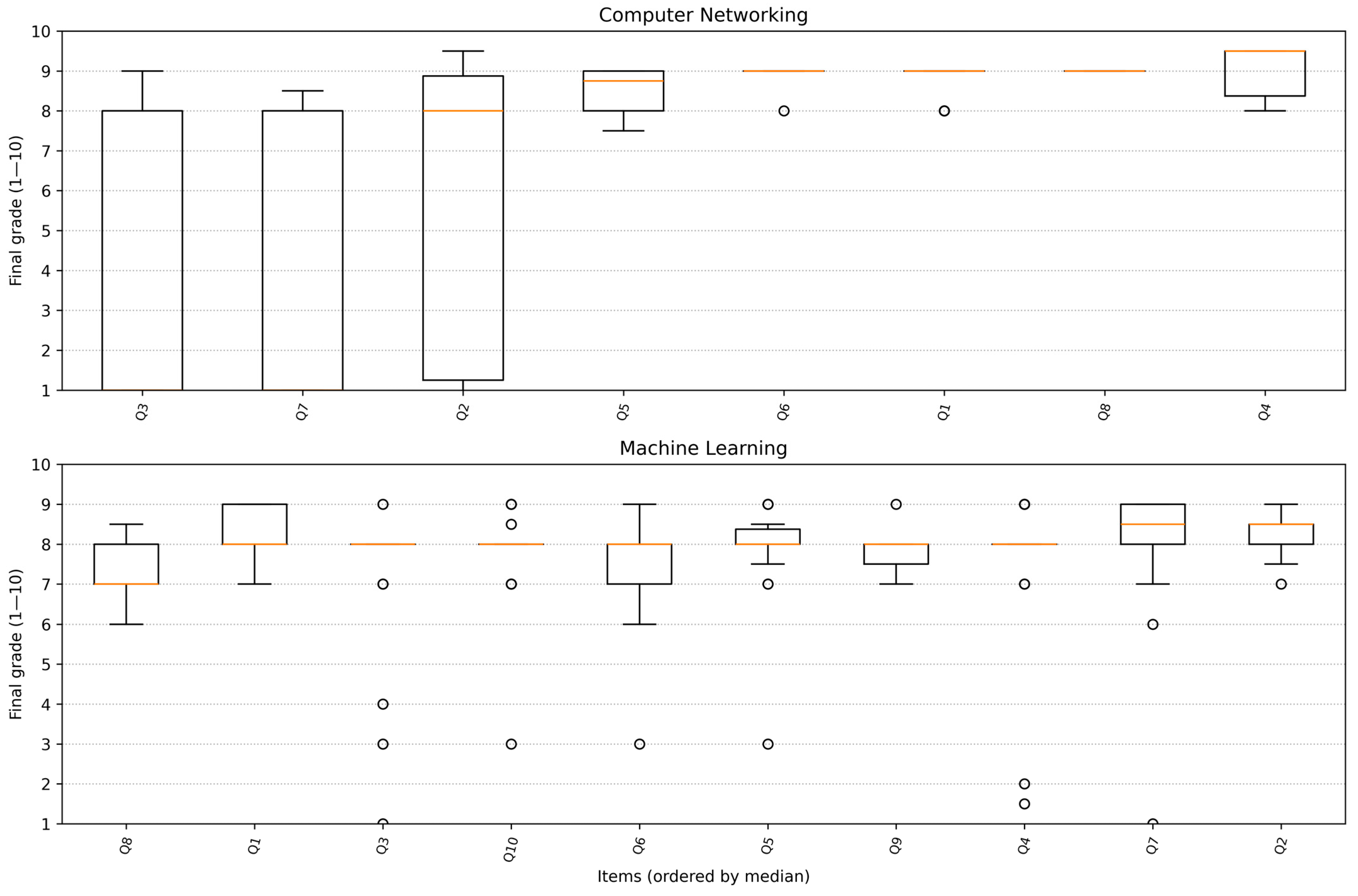 Figure 4. Per-item box-and-whisker plots of final grades (after chief adjudication), ordered by each item’s median. The top panel shows Computer Networking, and the bottom panel shows Machine Learning. Identical y-axis limits are used across domains. Orange lines show item medians.