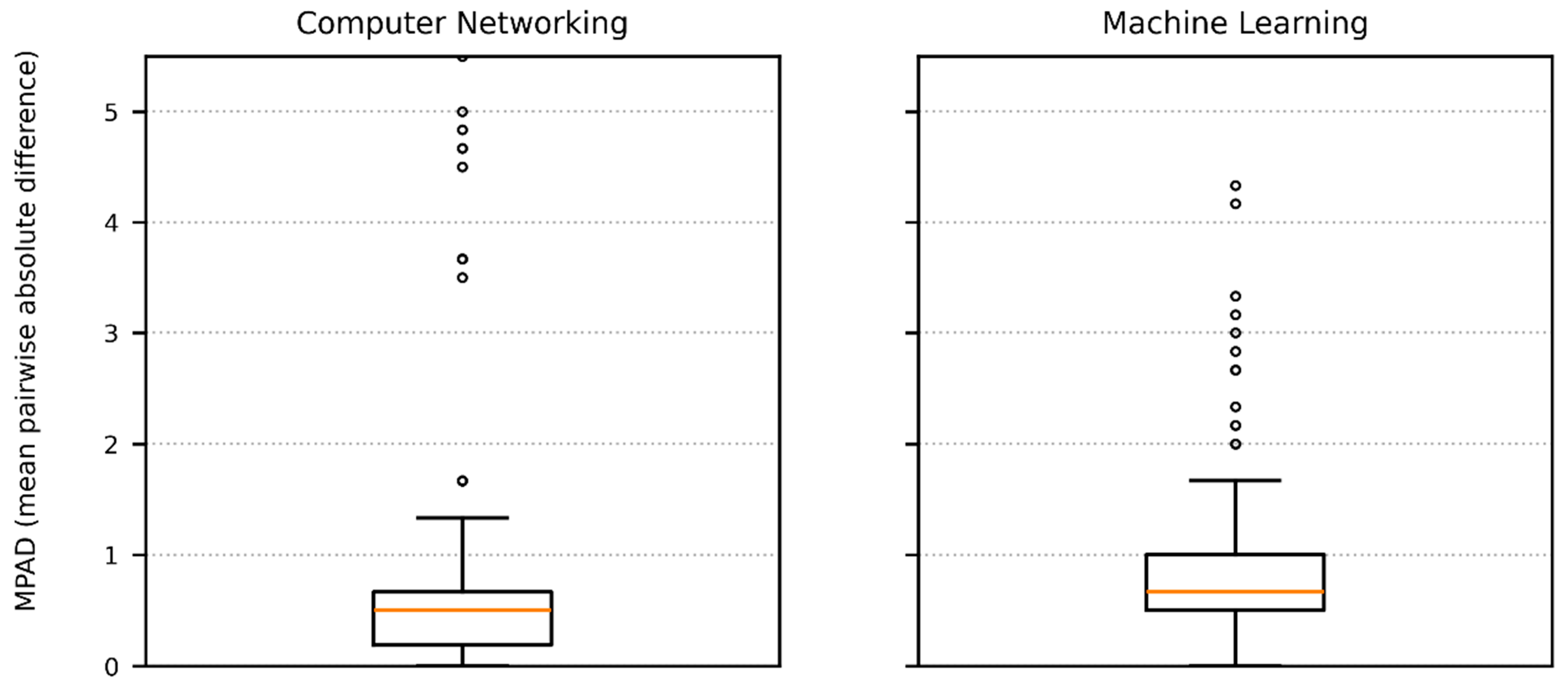 Figure 5. Within-panel agreement by domain on the 1–10 scale. Vertical box-and-whisker plots display the mean pairwise absolute difference (MPAD) for each response in Computer Networking (left) and Machine Learning (right). The y-axis uses identical limits (0–5.5) to facilitate comparison. Orange lines show item medians.