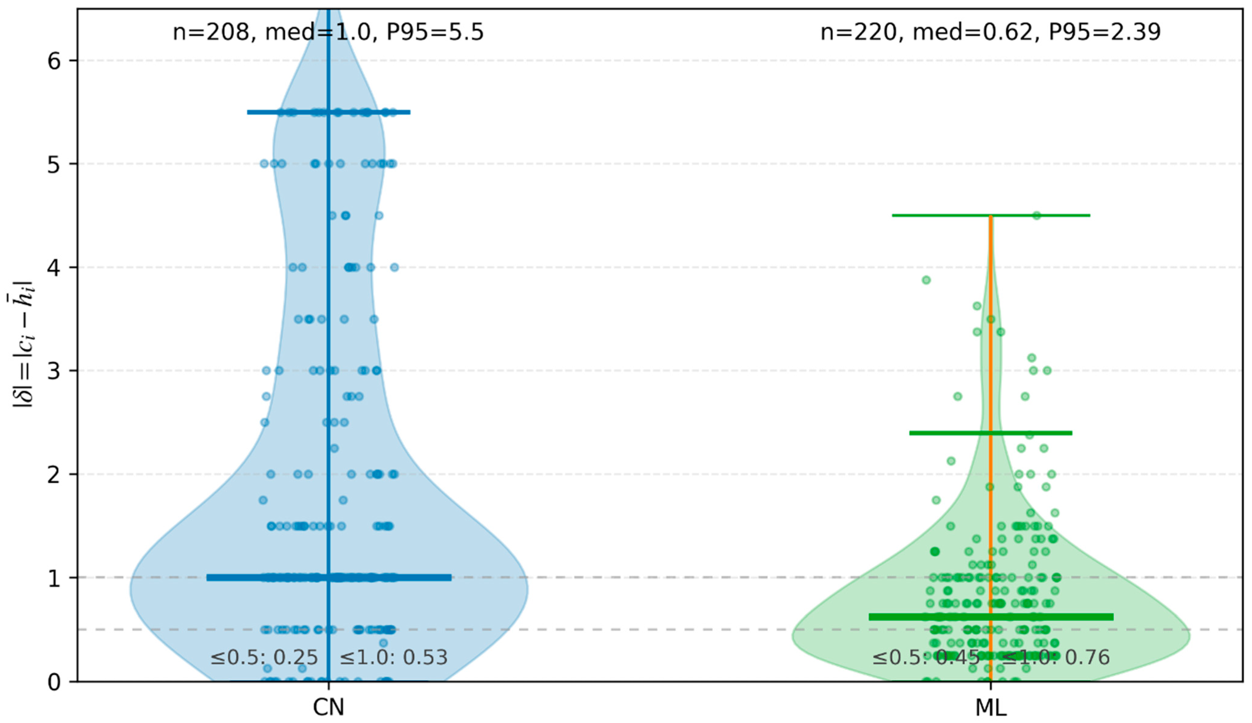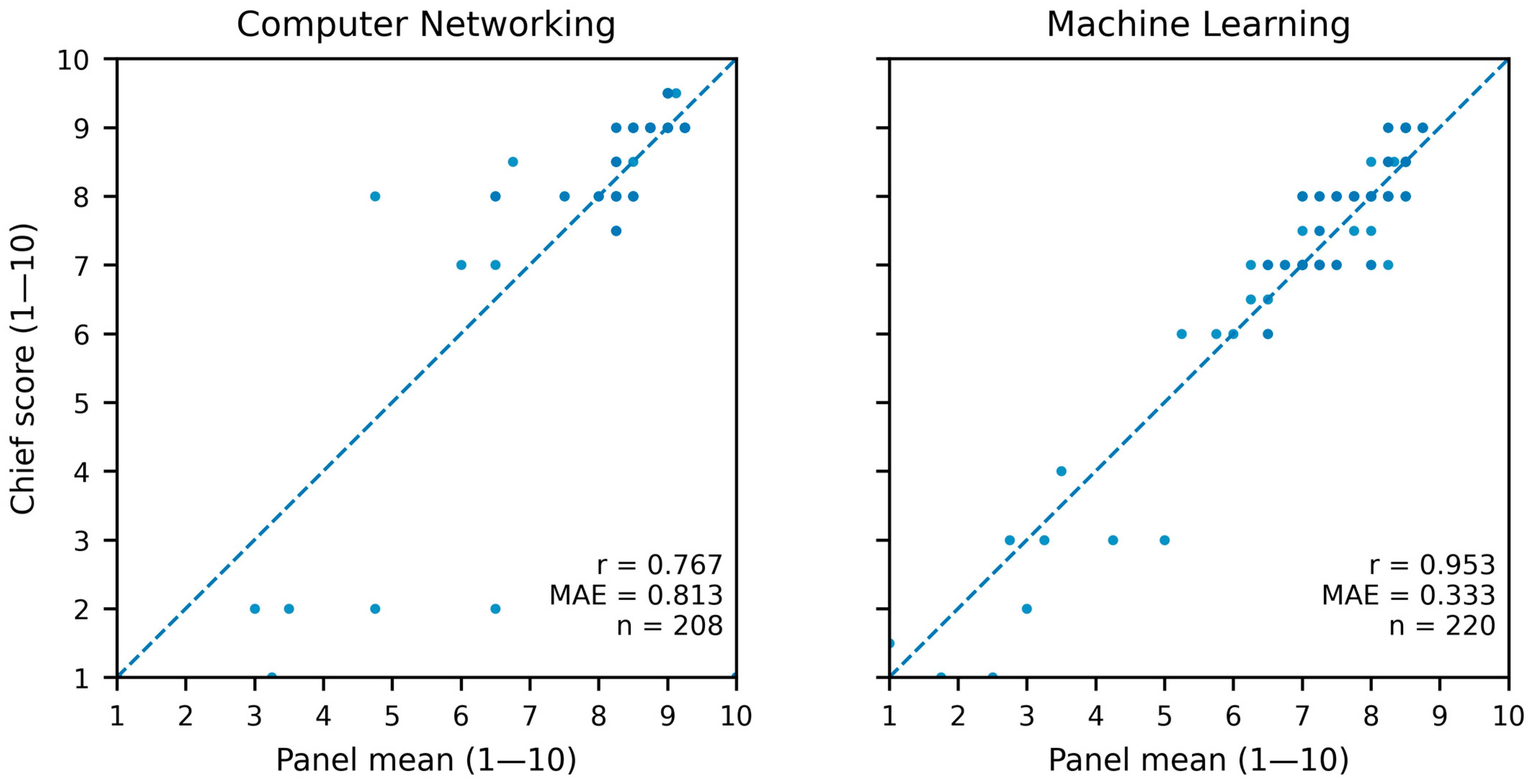 Figure 6. Chief–panel concordance. Scatter of chief score against the panel mean on the 1–10 scale, with the identity line and identical axis limits across domains, CN on the left and ML on the right. Points near the line indicate agreement, and the vertical distance encodes the chief–panel absolute difference. Sample sizes: CN n = 208, ML n = 220.