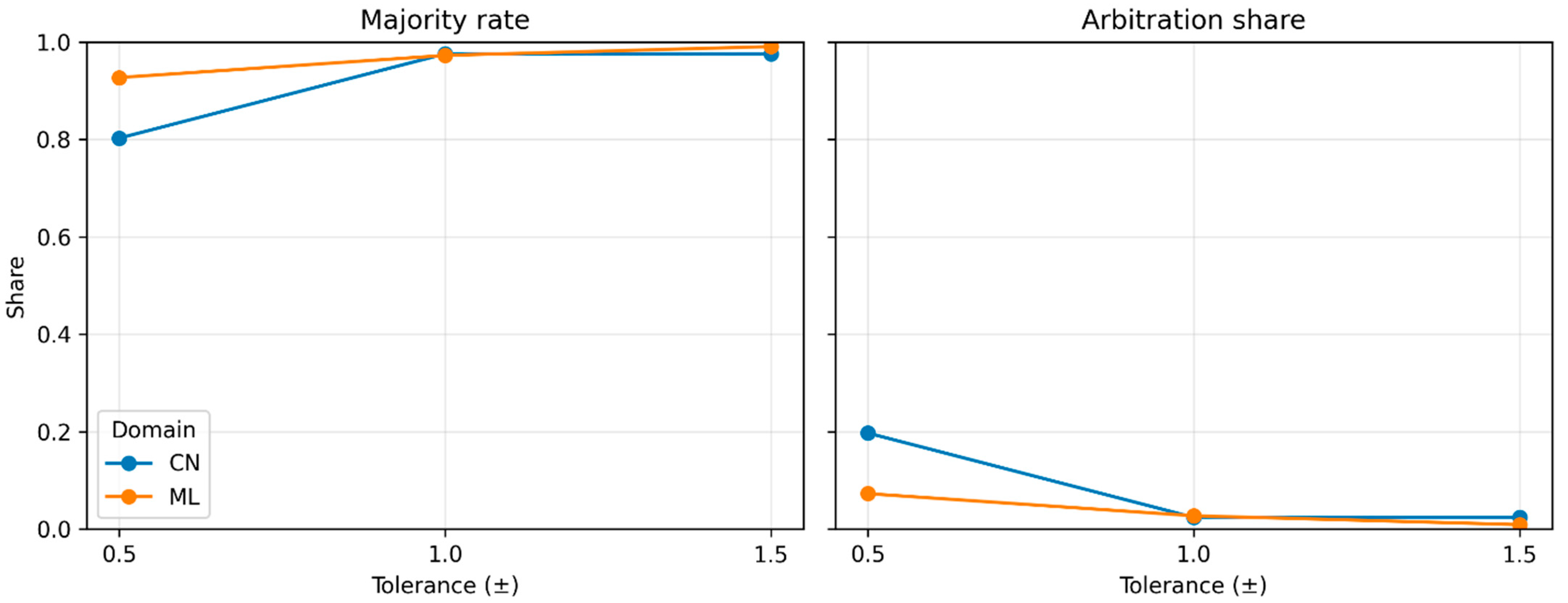 Figure 7. Tolerance sweep for panel decisions. The left shows the majority share. The right shows the arbitration share. Bands are ±0.5, ±1.0, and ±1.5 on the 1–10 scale. Axes are matched, CN on the left and ML on the right. Majorities approach saturation by ±1.0, with ML higher at ±0.5.