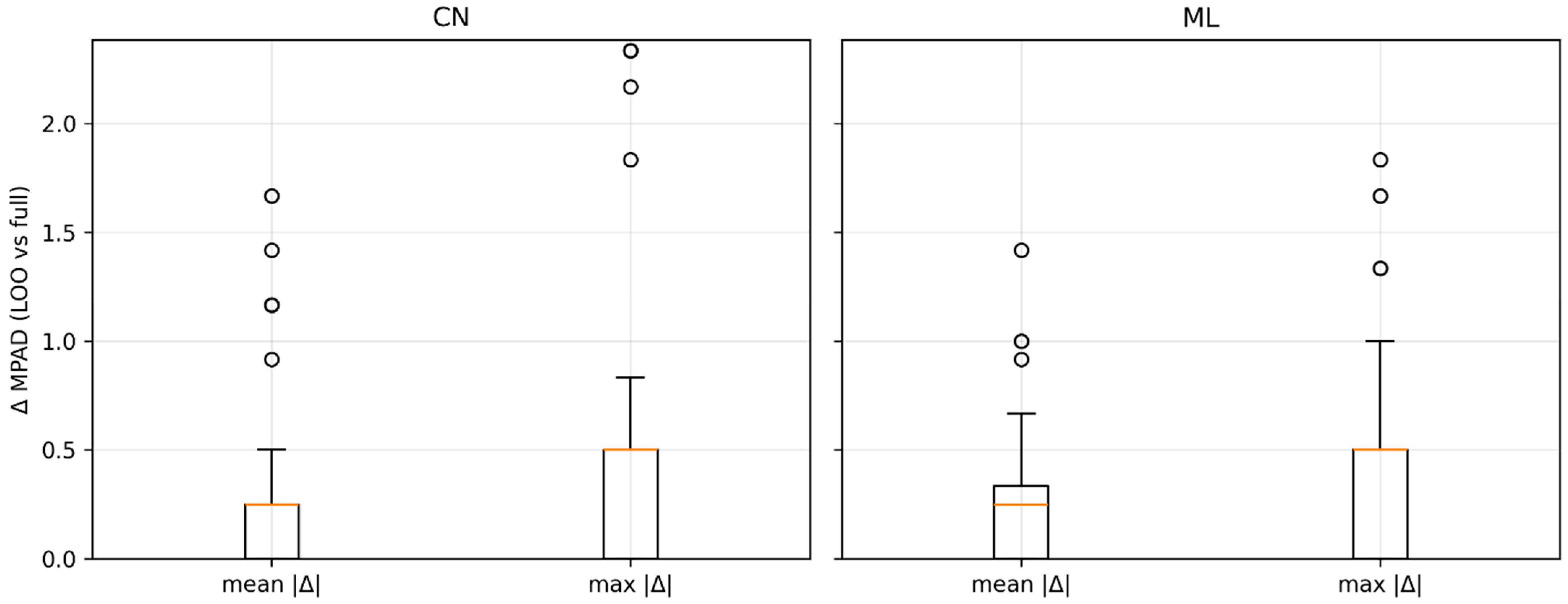 Figure 8. Leave-one-out sensitivity of within-panel dispersion. For each item with at least three panel grades, we compute mean|Δ| and max|Δ| across single-grader removals, where Δ = M P A D k M P A D f u l l and M P A D f u l l is computed over all panel grades. CN and ML use identical y-limits to enable direct comparison. Orange lines show item medians.