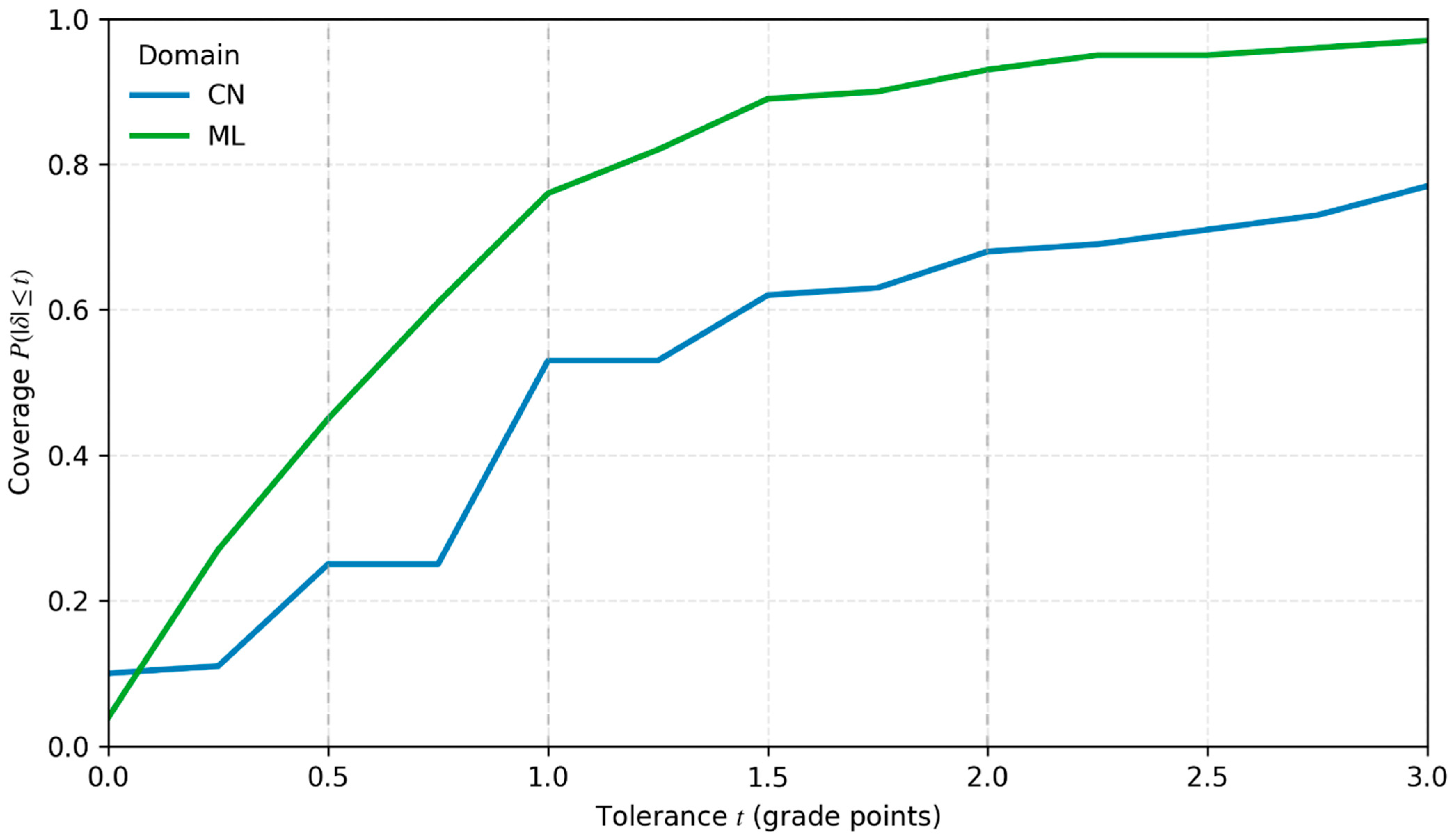 Figure 10. Human–LLM disagreement by tolerance. For each tolerance t 0 ,   3 grading points, the curves show the proportion of items with c i h ¯ i > t in CN and ML, drawn on common axes with the y-axis ranging from 0 to 1. Vertical guidelines at t = 0.5 ,   1.0 ,   a n d   2.0 mark typical grading thresholds. Lower curves indicate less disagreement and therefore tighter alignment.
