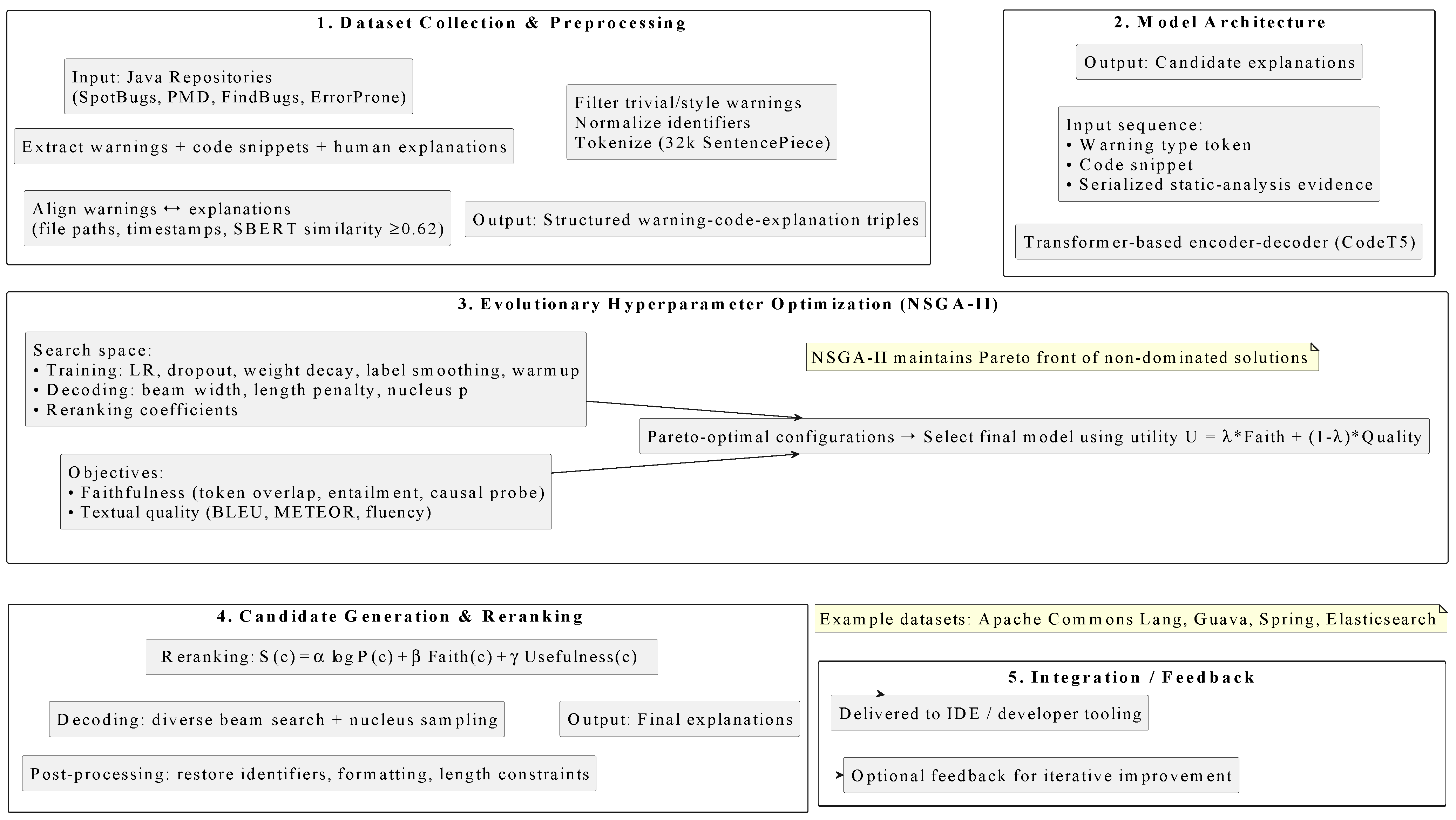 - A framework that integrates multi-source diagnostic signals with conditioned language-model generation to produce natural language justifications for code warnings.