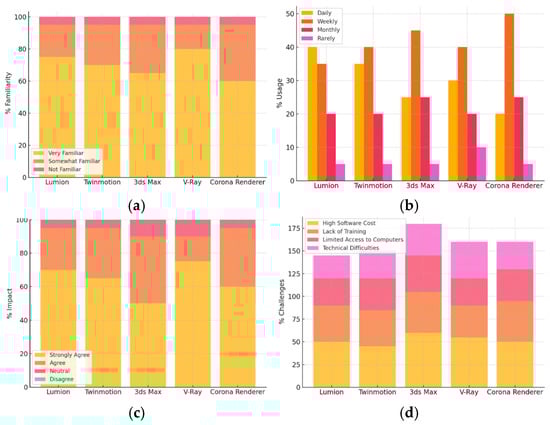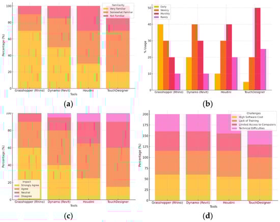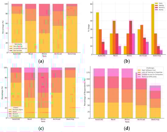 Results from this analysis show that AutoCAD and SketchUp have the highest familiarity, with 80% and 75% of respondents being very familiar with them, respectively. This indicates that these tools are well-established and commonly used in design education. While Revit and Archicad have lower familiarity levels (65% and 55%), suggesting that these tools are important but less universally recognized or adopted compared to AutoCAD. And finally, Rhino shows the lowest level of familiarity, with only 40% of respondents reporting high familiarity, possibly reflecting its more specialized use.