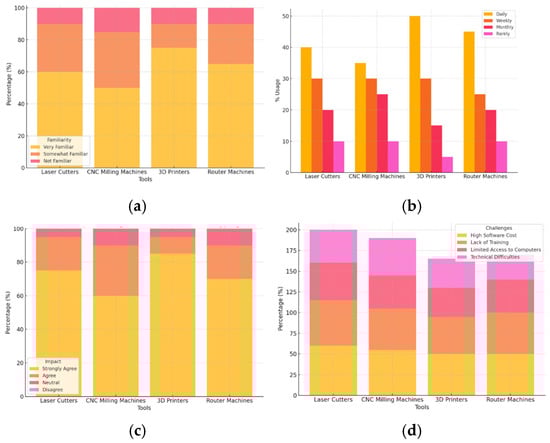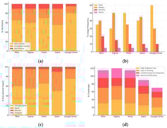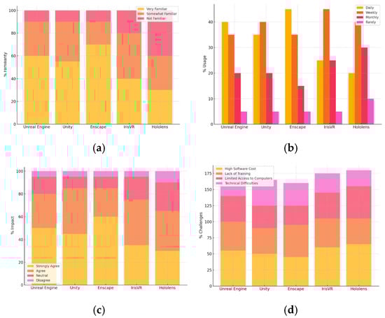 The outcomes support the idea that, while these tools have the potential to revolutionize design education, based on theoretical frameworks such as SAMR, it is clear that the comprehensive transformation has not yet occurred. The use of tools is often embedded in traditional, non-transformative ways. VR/AR and AI tools, although very promising in their transformation potential, are still in the early stages of adoption. Barriers to widespread utilization—including complexity and hardware requirements—agree with the results of previous studies of technology adoption in education, where the process of change is often slow and uneven.