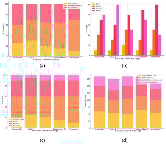 The study interestingly found that AI tools for design generation, like Runway ML and DALL·E, were less well-known and used, but they showed promise for having an impact on education. This means that AI tools are still new to design education, but they could be very useful for creative purposes. Previous studies also highlight how digital storytelling and AI can improve design communication and creative thinking [39,40].