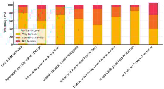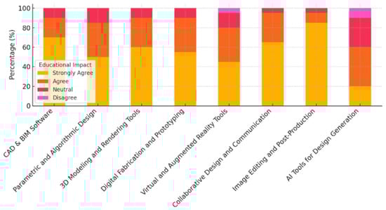 Even though eight categories of digital tools are assessed in this study, the wide range is not accidental. The target is to acquire an entire picture of the current adoption of various technologies, such as the CAD/BIM software, newly developed applications, such as VR/AR, and AI usage in the design education in Jordan. This approach to the methodology allows visualizing the entire picture of the digital transformation instead of focusing on the specific tools. The patterns of comparison that arise between these categories provide an understanding of the maturity of the adoption of digital and the trends in pedagogy that can be observed within design programs.
